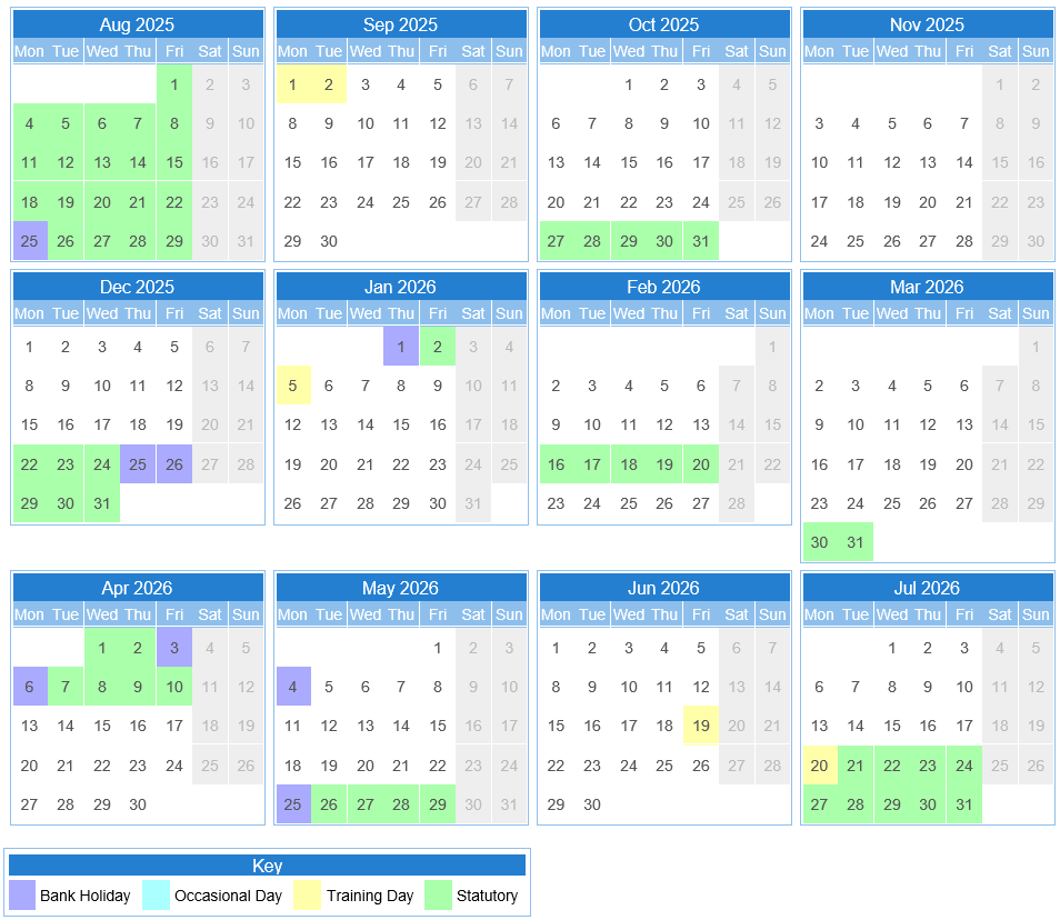 Holiday Schedule 2026/2027